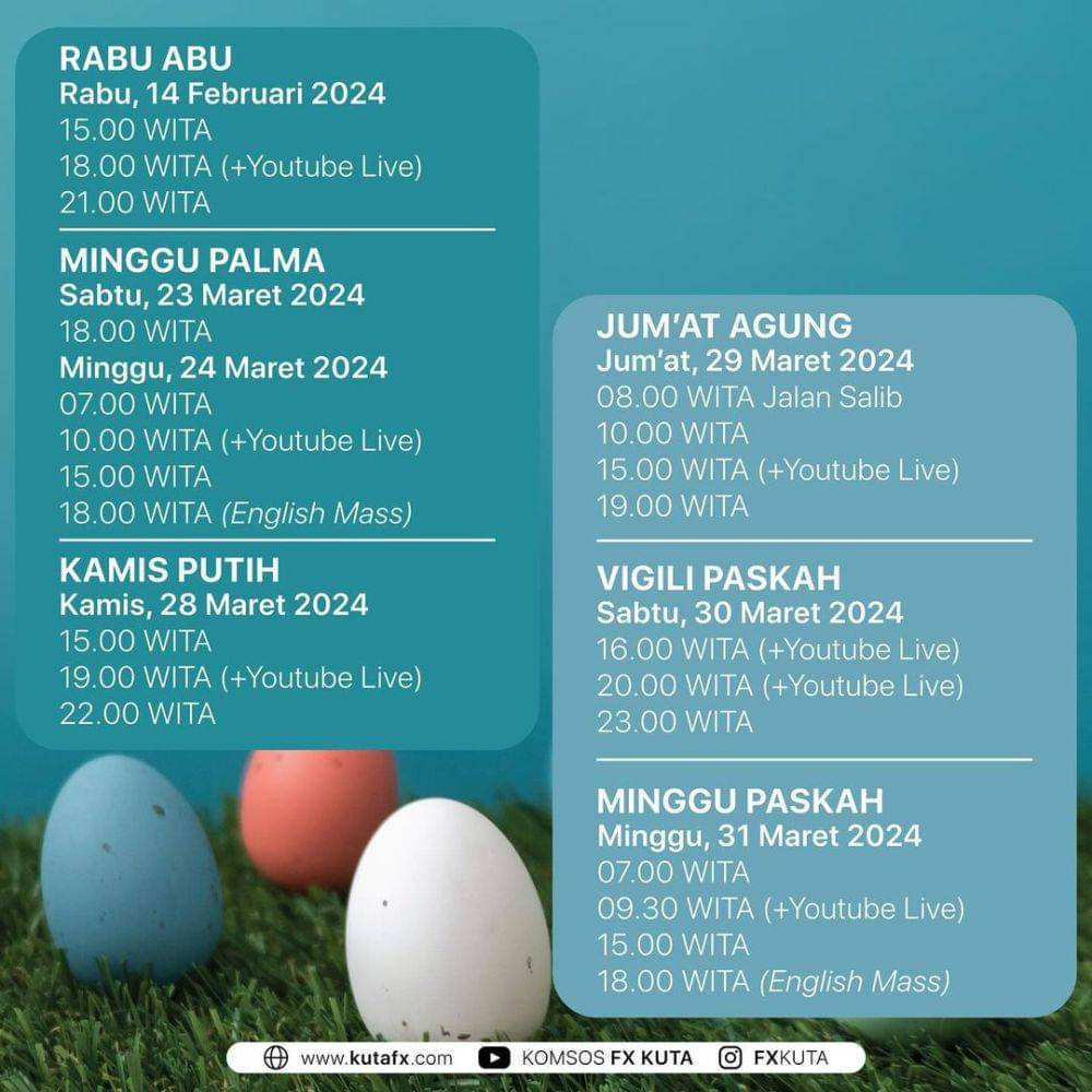 Misa Kamis Putih pada hari Kamis besok dimulai pukul 19.00 Wita. Kemudian pada hari Jumat, ada ibadat Tablo atau Kisah Sengsara pada pukul 07.00 Wita. Sedangkan Misa Jumat Agung akan dimulai pukul 15.00 Wita. Hari Sabtu atau Vigili Natal, akan ada misa pukul 19.00 Wita. Yang terakhir misa Hari Raya Paskah akan dimulai pagi hari pukul 07.30 Wita.