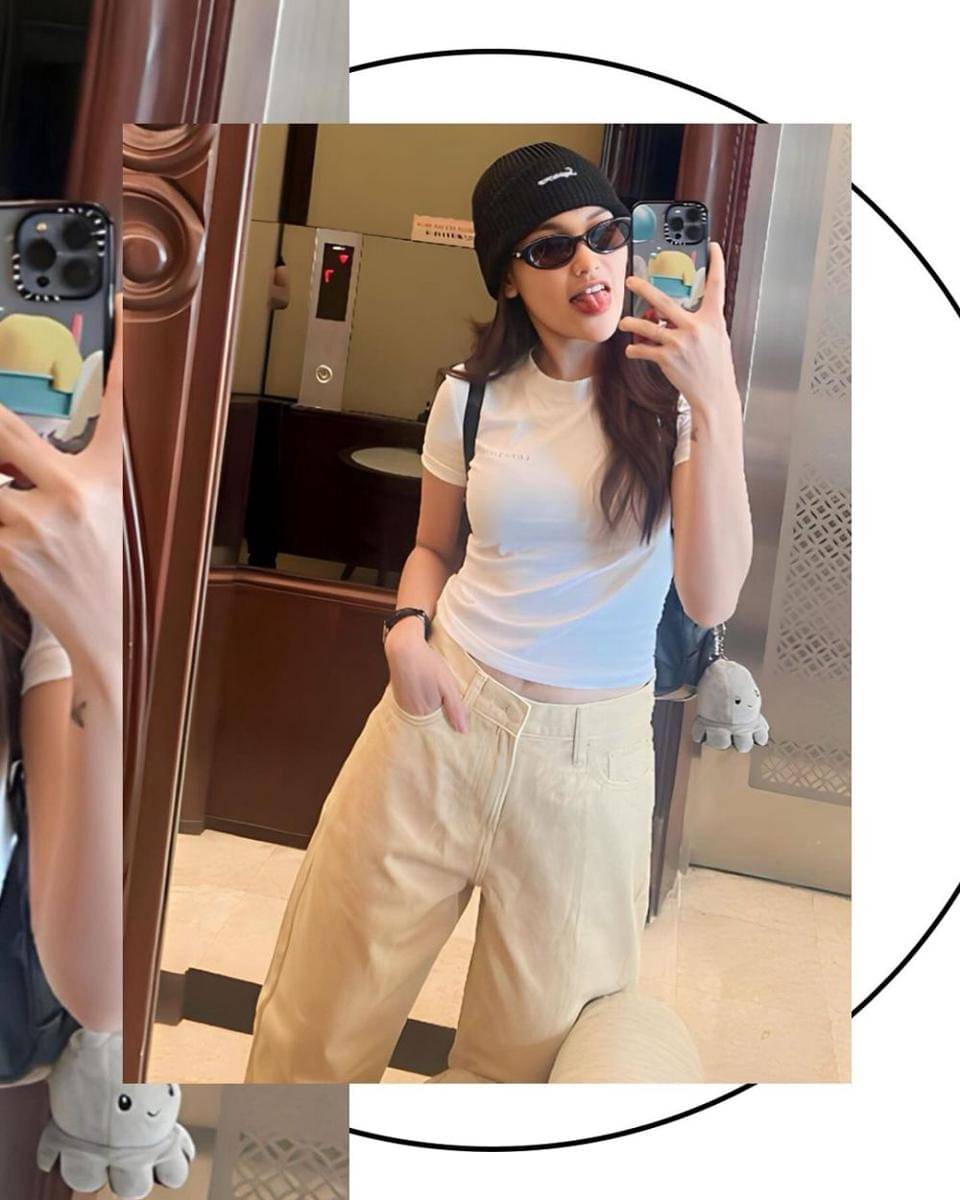 7. Sesekali mencoba gaya boyish, Ayu memadukan crop tee putih dan loose denim krem dengan beanie hat dan kacamata serba hitam