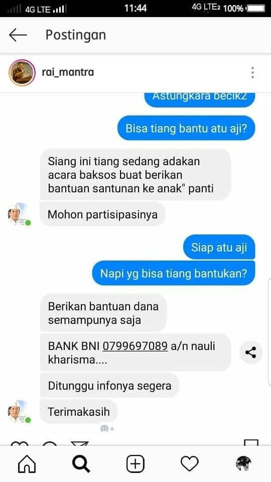 Pelaku memanfaatkan Facebook Rai Mantra untuk meminta uang, dengan modus mengadakan kegiatan bakti sosial (Baksos) dan memberikan bantuan atau santunan uang kepada anak panti. Pelaku lalu meminta supaya mentransfer ke rekening Bank Negara Indonesia (BNI) atas nama Nauli Kharisma.